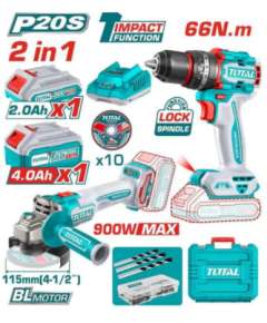 Total TCKLI20273 Cordless 2 pcs combo kit- Cordless Angle Grinder and Compact Brushless Cordless Impact Drill
