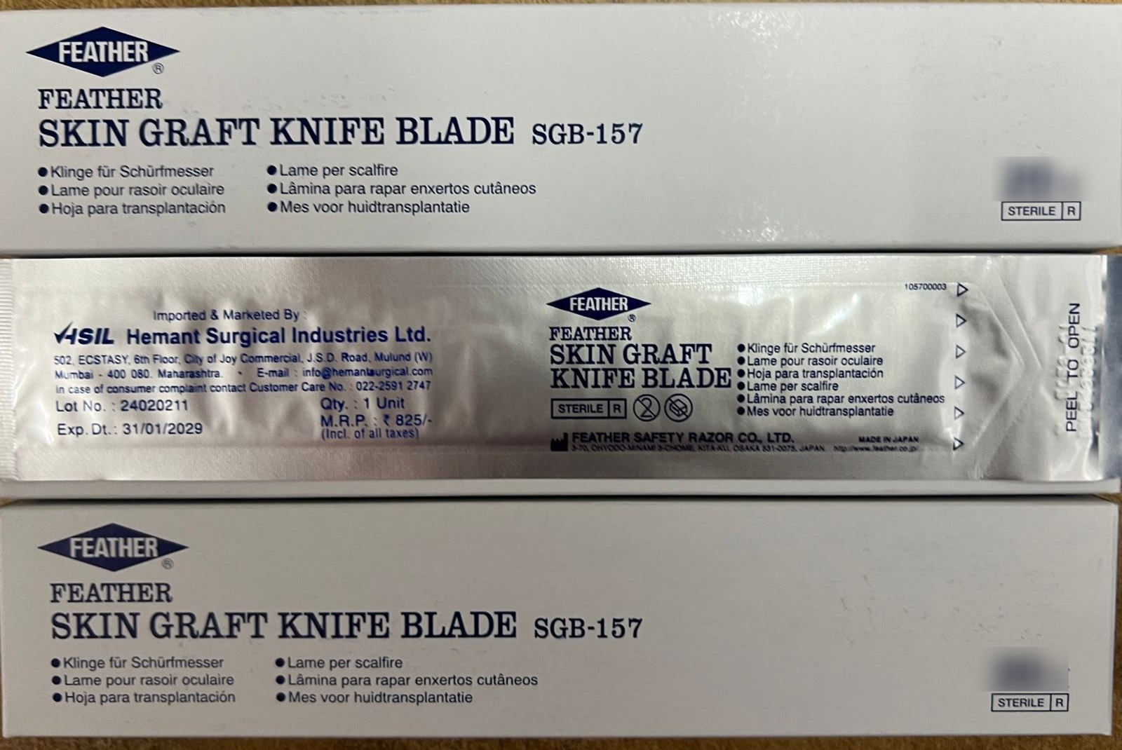 FEATHER SKIN GRAFT BLADE is used in the surgical removal of a patch of healthy skin from one area of the patient's body.
