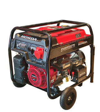 Honda EM8000ETS is a 6.5KVA single and three-phase Generator with key start, battery, and wheels