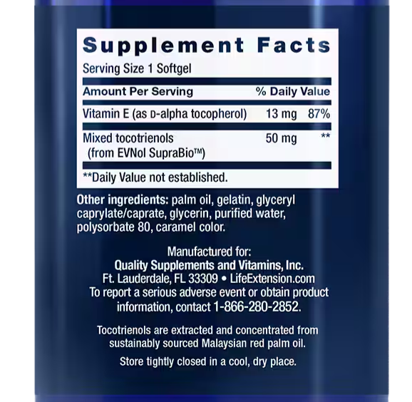 >Life Extension's Super-Absorbable Tocotrienols softgels deliver high-quality vitamin E tocotrienols derived from red palm oil from the Elaeis guineensis tree.