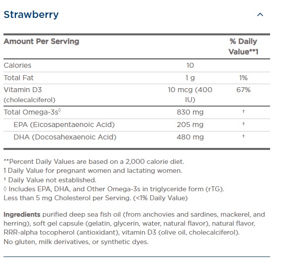 - 830 mg total omega-3s; 400 IU Vitamin D3