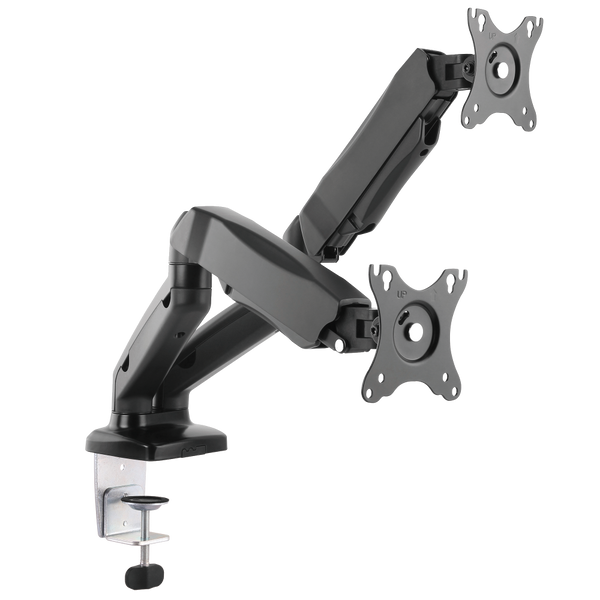 - Dual desk mount fits most 13 to 27-inch LCD LED screens up to 14.3 lbs with VESA 75 x 75 – 100 x 100