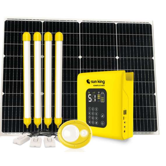 - 4 x 12 V DC ports (120 W max. total, 5 A max. per port) compatible with Sun King’s DC appliances for powering Sun King’s lamps, TVs and pedestal fans.