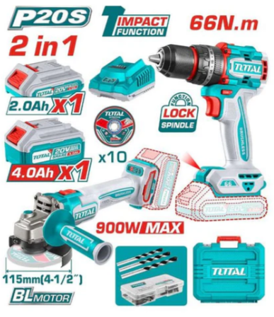 Total TCKLI20273 Cordless 2 pcs combo kit- Cordless Angle Grinder and Compact Brushless Cordless Impact Drill