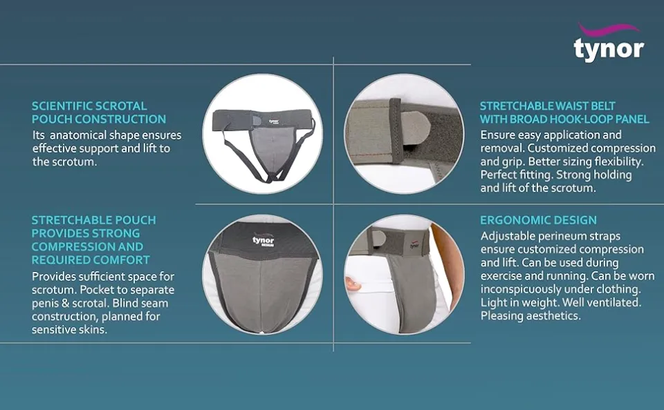 • Stretchable Waist belt with broad hook-loop panel ensure easy application and removal, customized compression and grip, better sizing flexibility for perfect fitting, strong holding and lift of the scrotum.