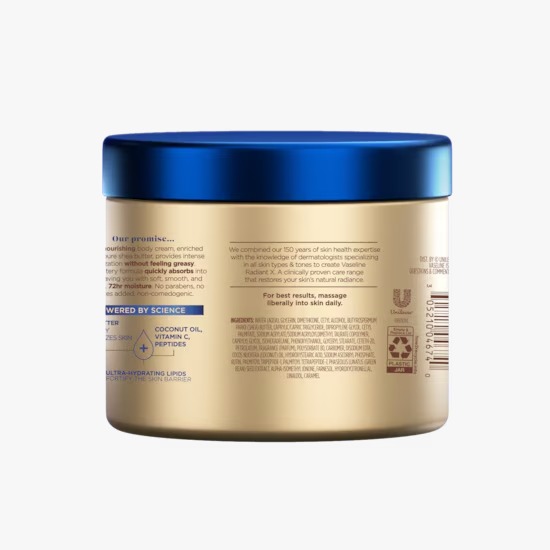 An ultra-nourishing body cream, enriched with 100% pure Shea Butter, Coconut Oil, Vitamin C and Peptides. Vaseline® Radiant X Deep Nourishment Body Cream provides intense moisturization, leaving the skin noticeably softer, smoother, and radiant.
