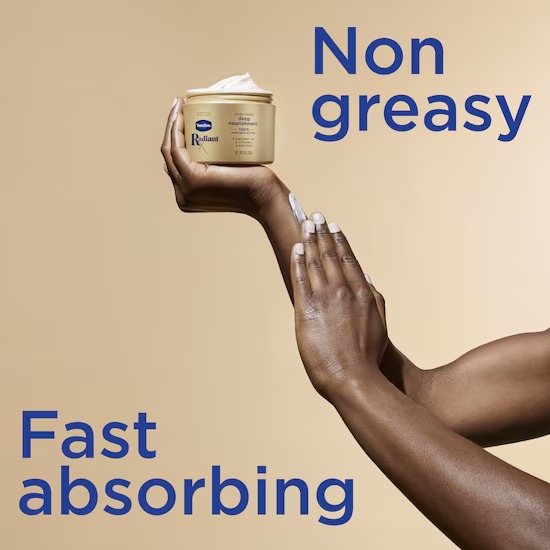Scoop fingertips through Vaseline® Radiant X Deep Nourishment body cream and gently massage it into your skin until absorbed, focusing on areas that need extra moisturization. For best results, use the body cream daily or as needed, especially after bathing or showering.