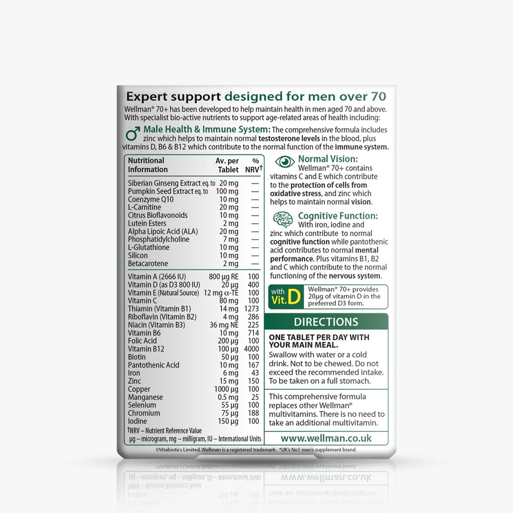 Wellman 70+ provides a comprehensive range of 30 vitamins, trace elements and specialist advanced nutrients specifically formulated to help safeguard the nutritional needs of men aged 70 and above.