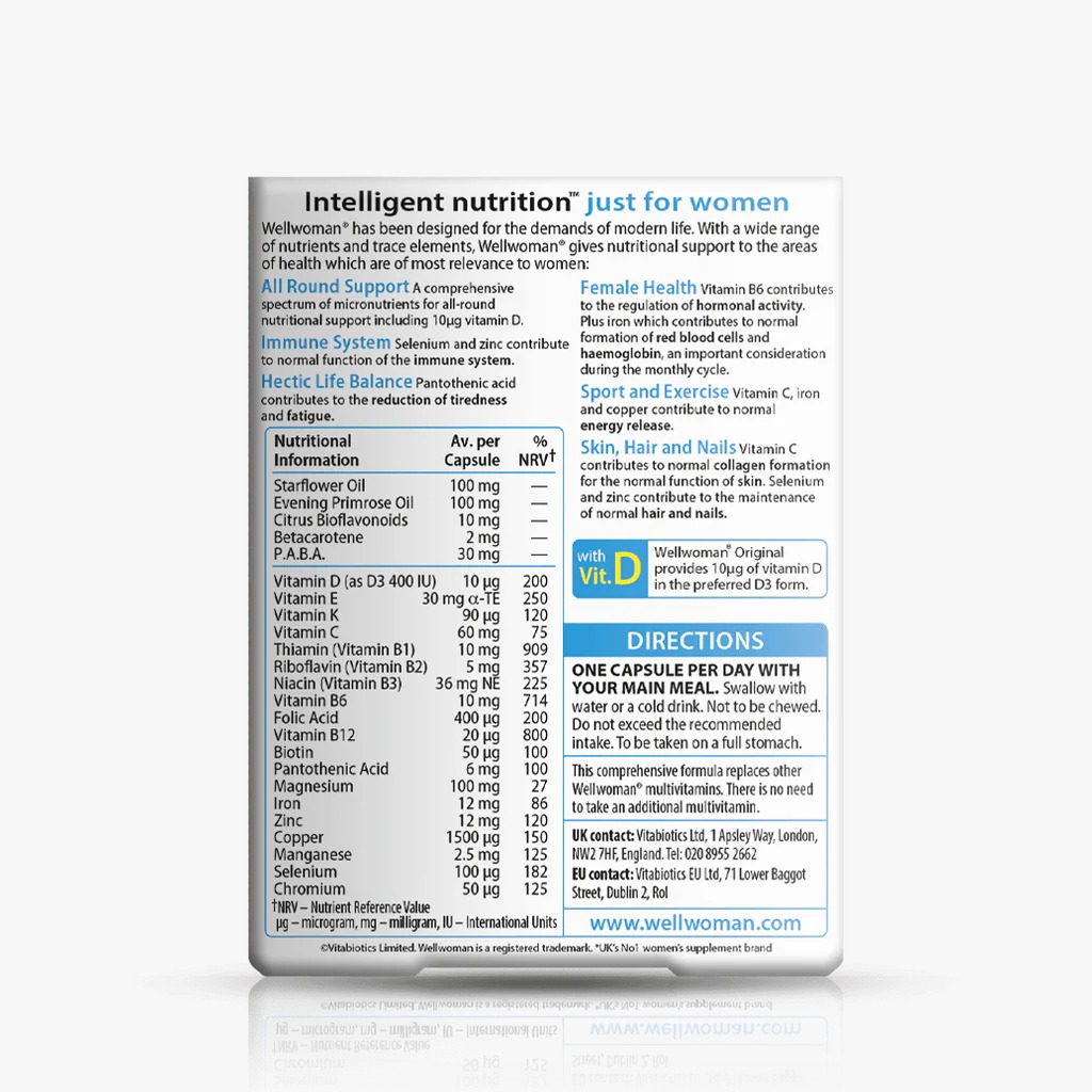 Wellwoman is the original vitamin developed just for women and has been formulated for the demands of modern life and to give support to the areas of health which are of most relevance to women. The comprehensive daily multivitamin contains a wide range of nutrients and trace elements including Evening Primrose and Starflower Oil.