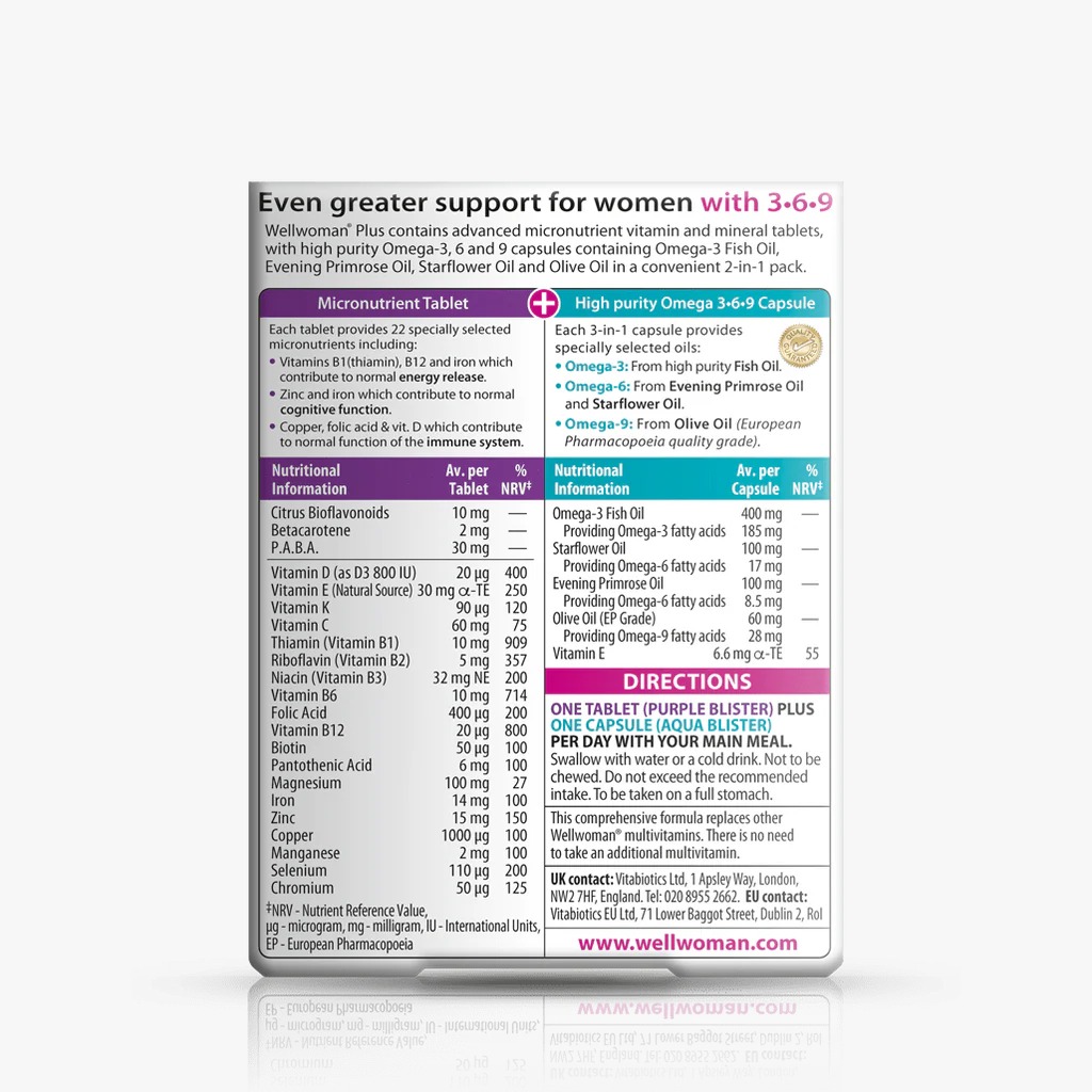 Wellwoman Plus forms part of the Wellwoman range, the UK's No 1 supplement brand for women. Wellwoman Plus Omega 3·6·9 contains an advanced comprehensive vitamin and mineral nutritional supplement, with the added benefits of Omega 3, 6 and 9 in a handy dual pack.